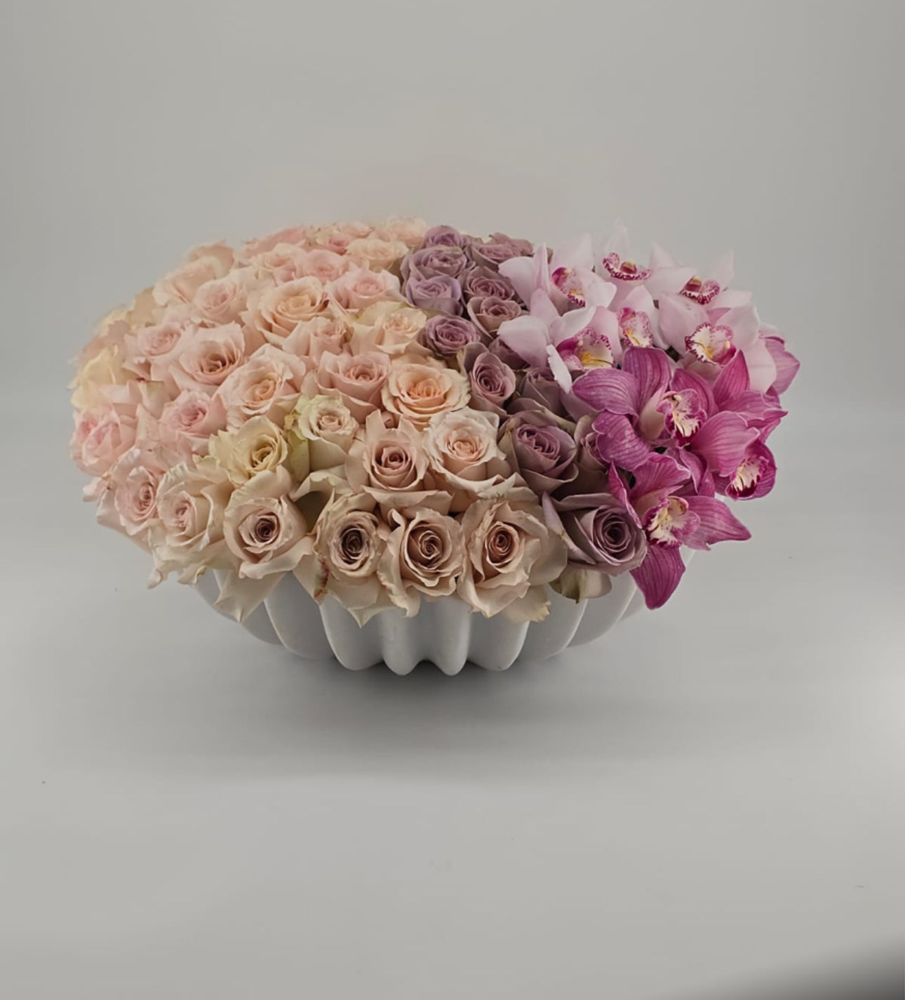 This exquisite arrangement features a lush blend of pastel roses and vibrant orchids, elegantly arranged in a modern white ceramic scalloped bowl, creating a sophisticated and luxurious floral display.