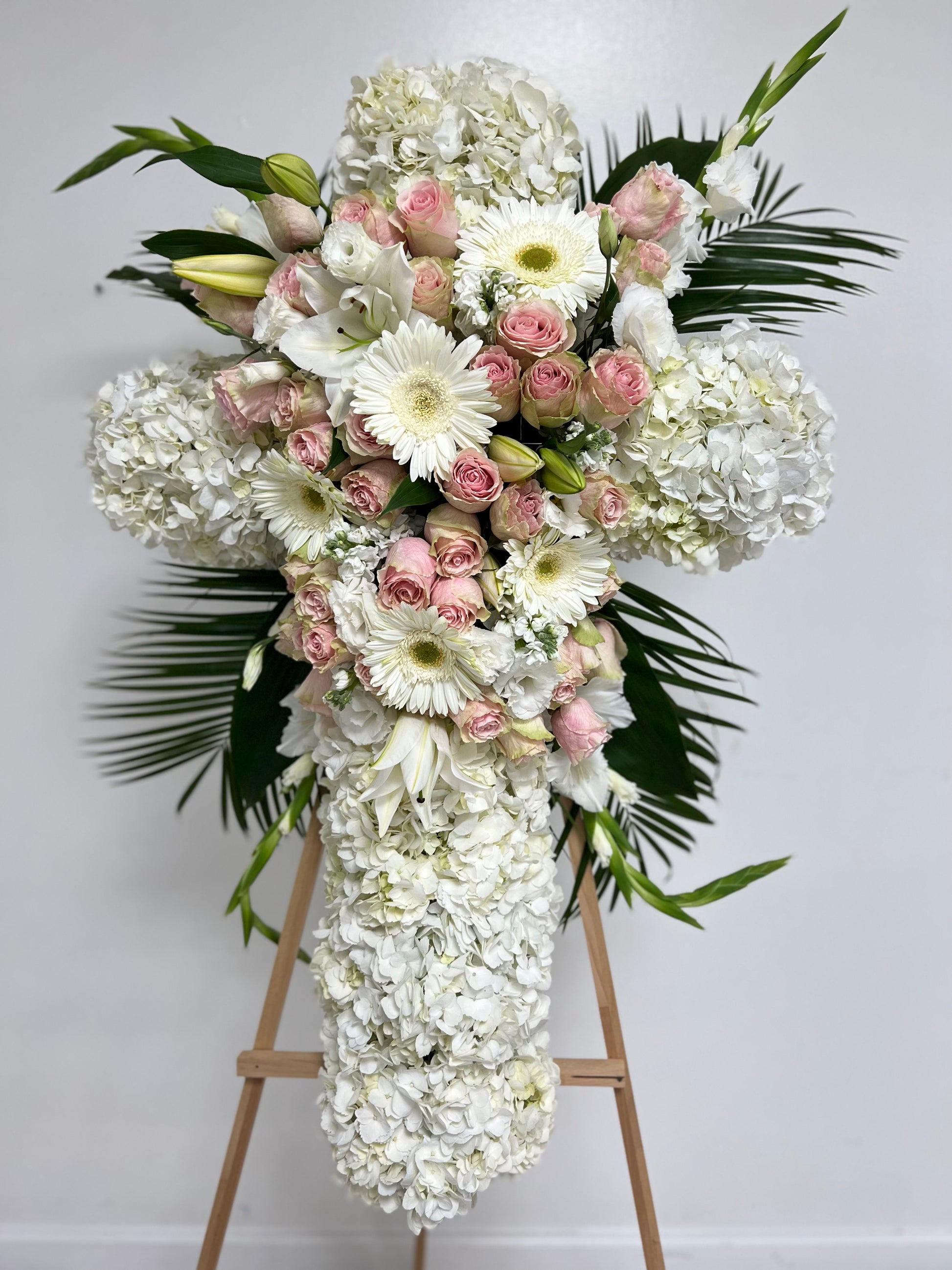 This arrangement features a cross-shaped design with soft pink roses, white lilies, and hydrangeas.