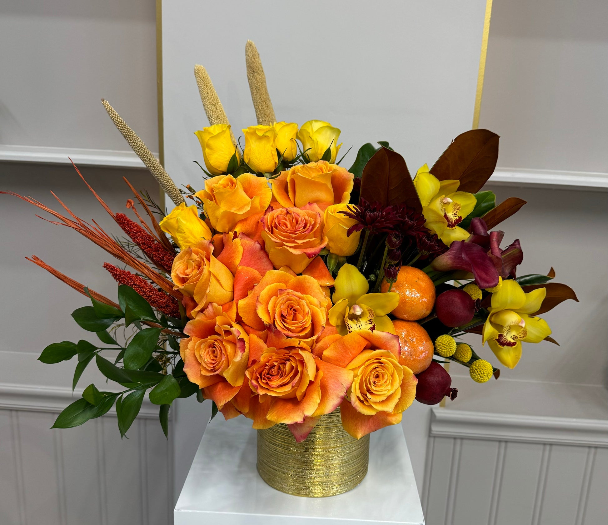 This vibrant arrangement features a striking combination of sunset-orange roses, sunny yellow orchids, and deep burgundy accents, complemented by lush greenery and unique textural elements, all presented in a luxurious gold-textured vase for a warm and elegant centerpiece.