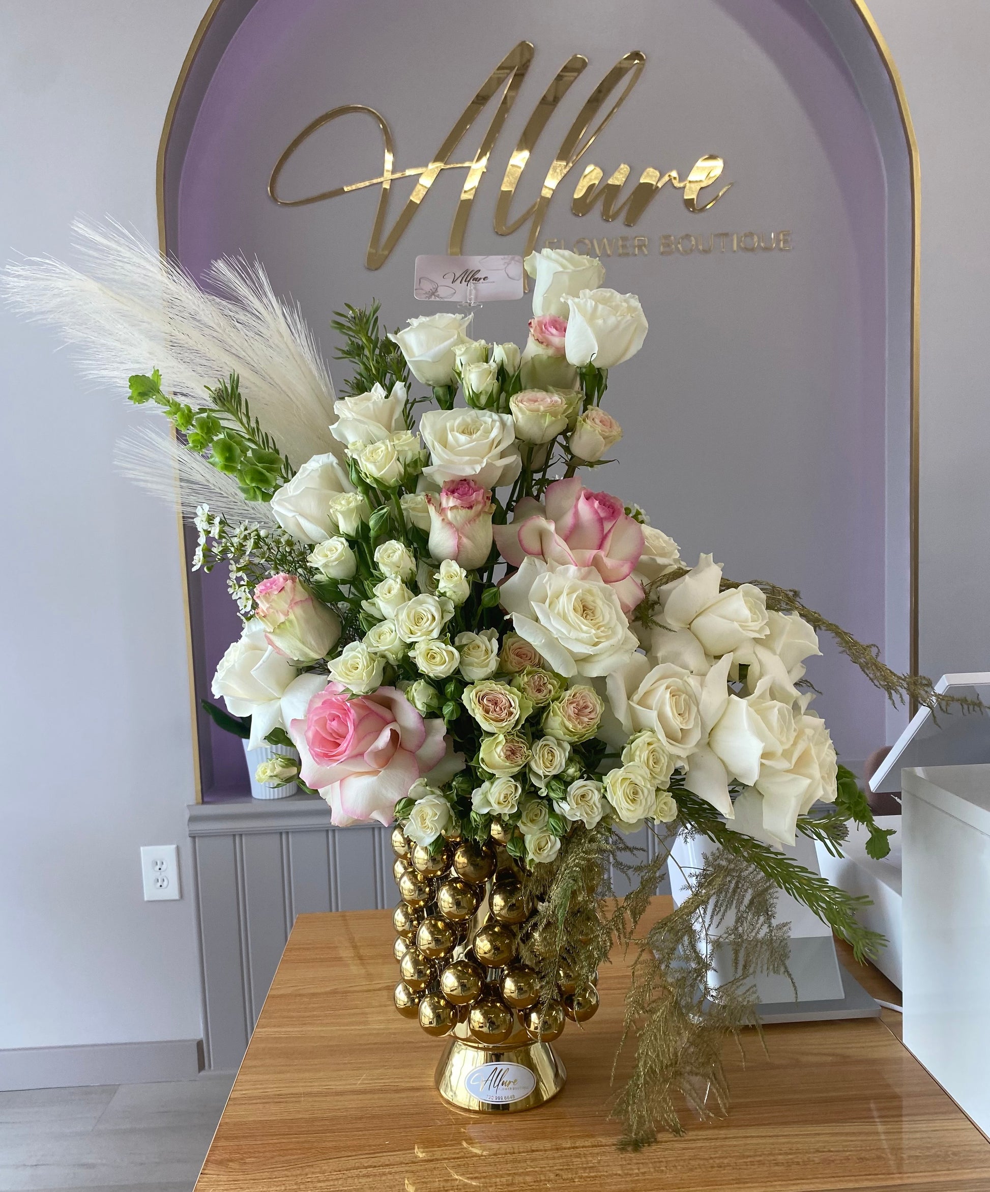 An elegant arrangement of creamy white and soft blush roses, artfully layered with delicate spray roses and feathery pampas grass for a touch of natural texture. Presented in a sculptural gold vase, this timeless design evokes sophistication, balance, and effortless beauty.