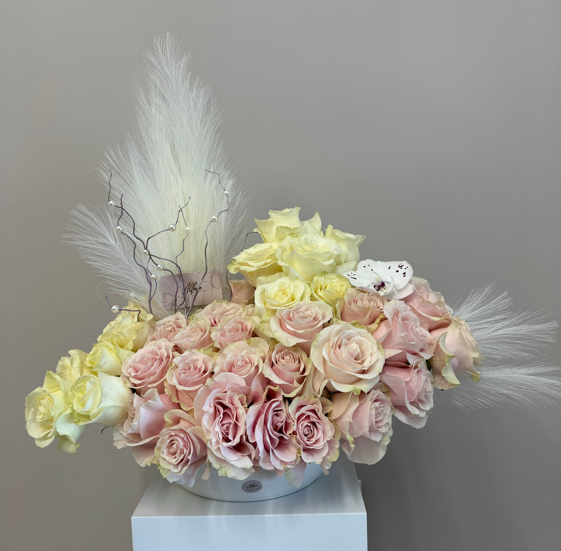 This luxurious arrangement features a graceful combination of soft blush and creamy ivory roses, accented with feathery pampas grass, delicate orchid blooms, and pearl-adorned branches for an added touch of elegance. Arranged in a sleek white vessel, this design radiates serenity and sophistication, making it a timeless centerpiece for any space.