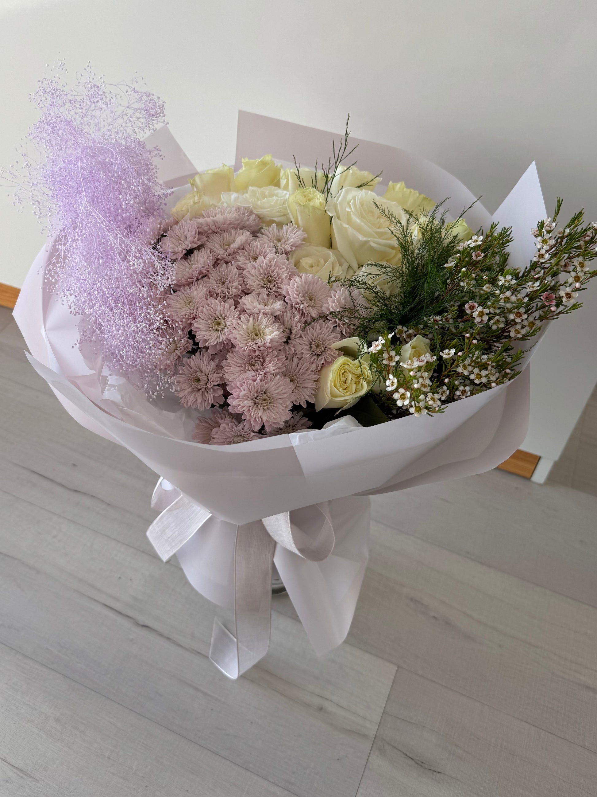 A delicate bouquet of ivory roses, blush-toned chrysanthemums, and airy lavender mist, beautifully wrapped in soft white paper. Accented with fresh wax flowers and feathery greens, this graceful arrangement exudes gentle elegance and serene charm. ( Vase not included; available upon request. )
