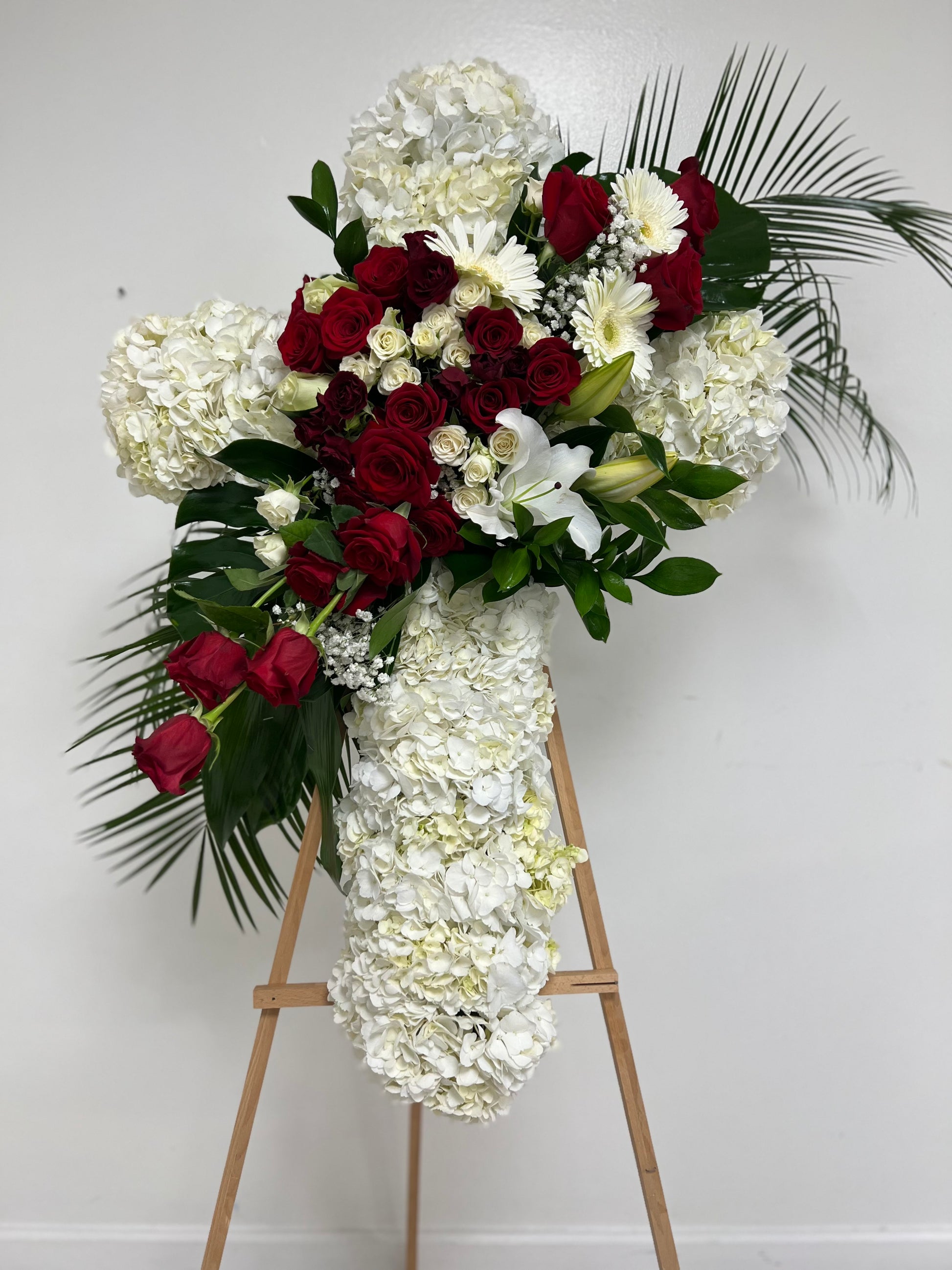 This arrangement features a cross-shaped design adorned with red and white roses, hydrangeas, and lush greenery.