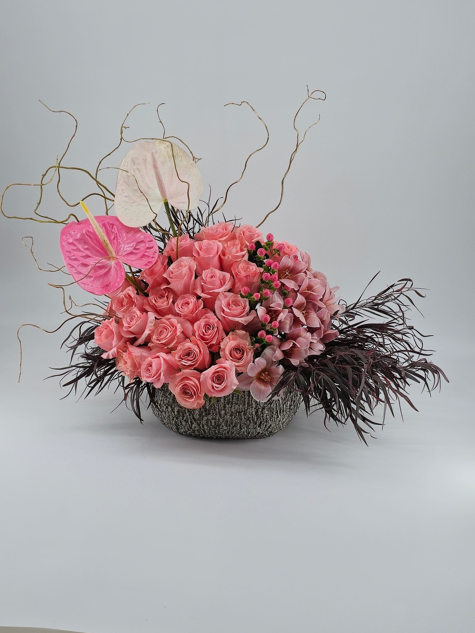 This elegant arrangement features a lush blend of pink roses, anthuriums, and delicate orchids, accented with curly willow branches and dark foliage, all beautifully arranged in a textured stone-like vase for a stunning and contemporary centerpiece.