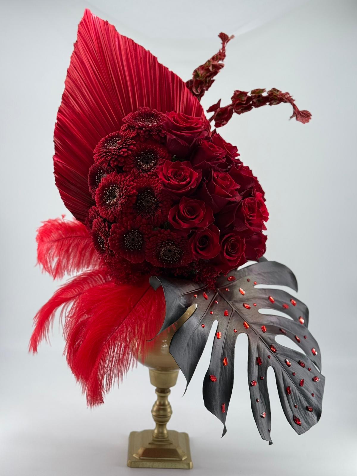 This bold and luxurious arrangement features rich red roses and textured blooms, accented with striking red feathers and a metallic leaf adorned with red jewels, all elegantly displayed in a gold pedestal vase for a dramatic and opulent floral statement.