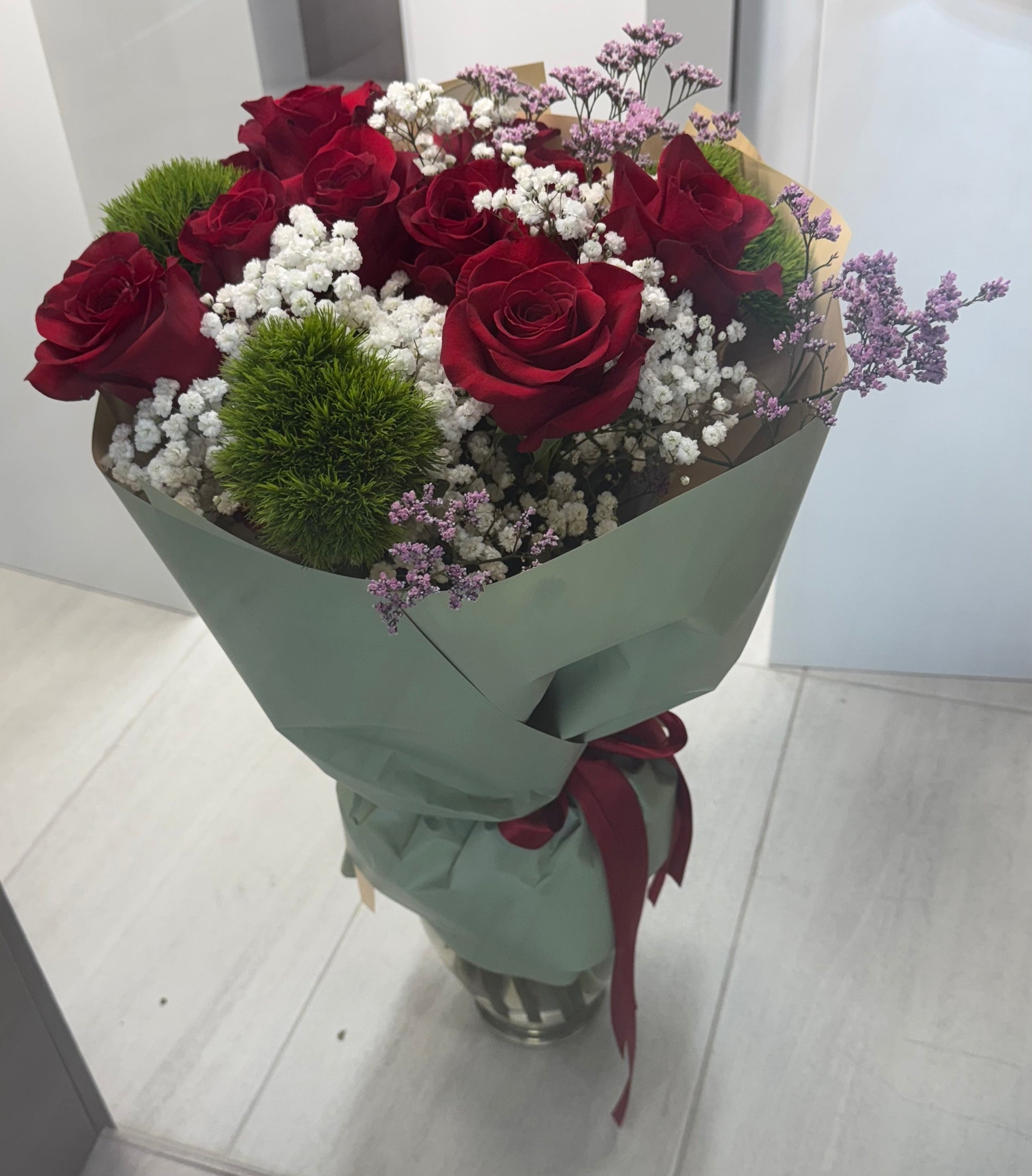 A rich bouquet of velvety red roses paired with white baby's breath, soft lilac filler, and vivid green moss for a playful yet refined contrast. Wrapped in sage-toned paper and finished with a deep red satin ribbon ( Vase not included; available upon request. )