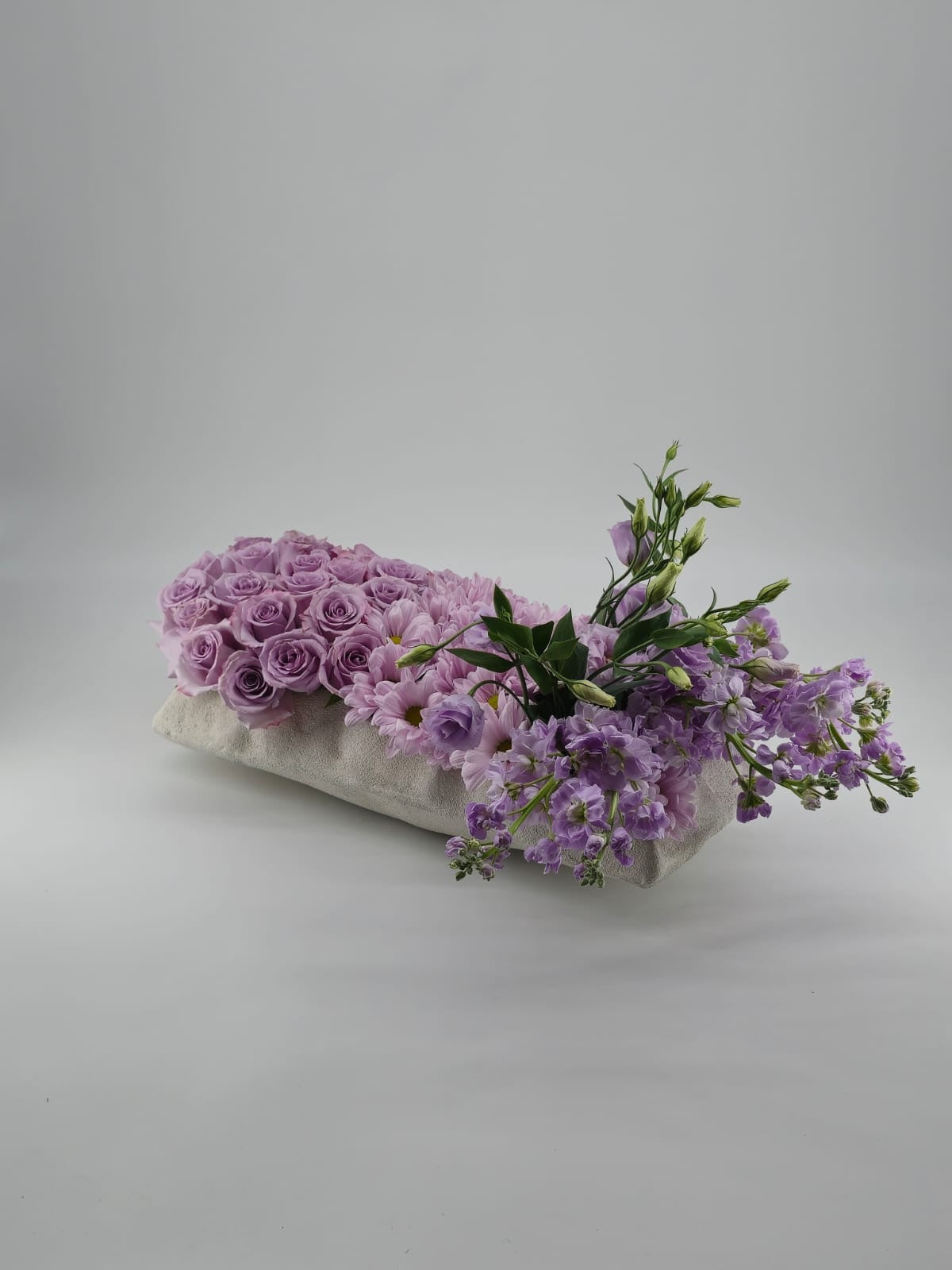 This stunning arrangement showcases a harmonious blend of soft lavender roses and delicate purple blooms, artfully arranged in a rectangular base, creating a modern and serene centerpiece perfect for elegant occasions.