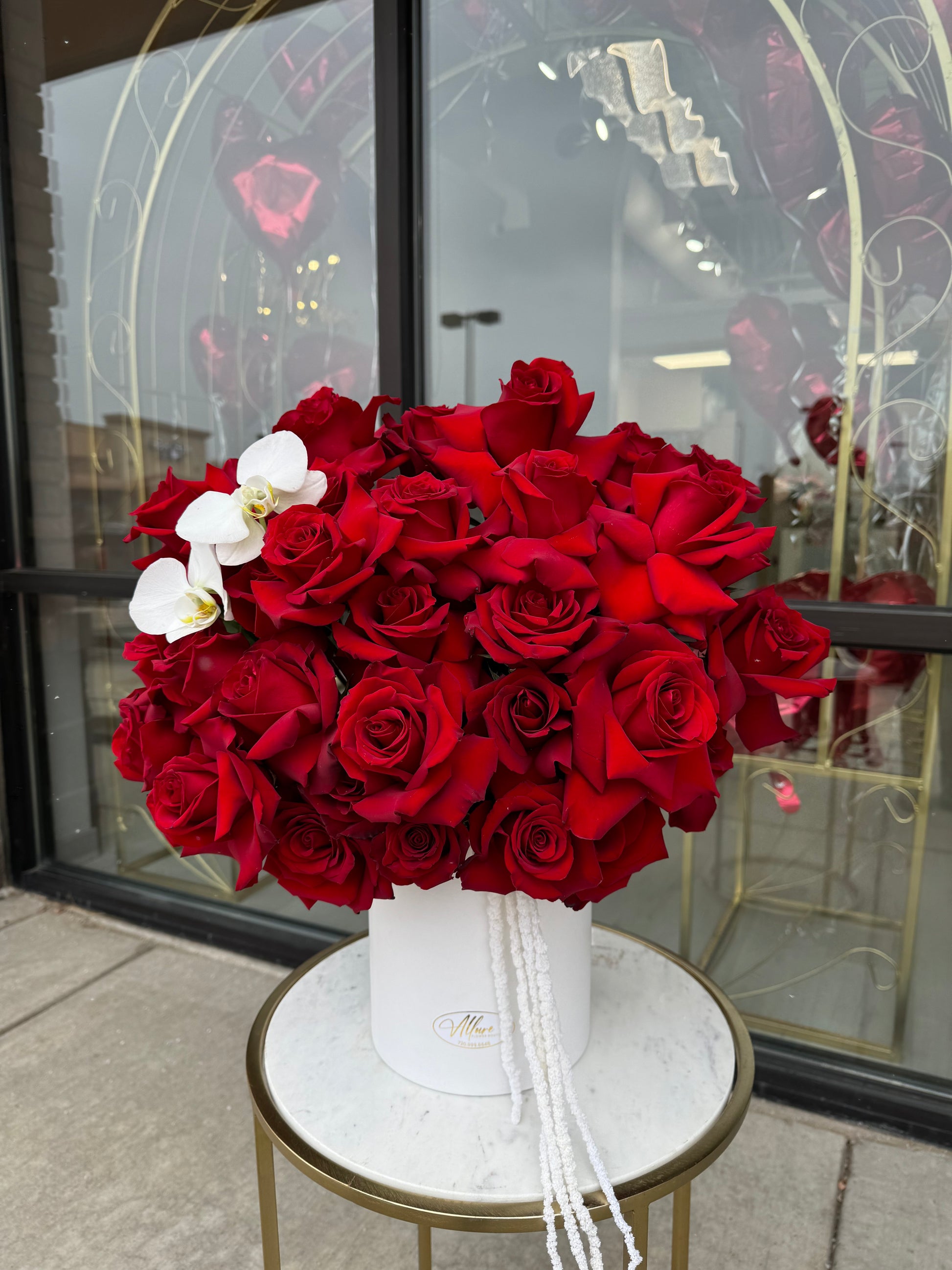 A stunning arrangement of rich red roses, accented with elegant white orchids and cascading details, presented in a chic white hatbox perfect for any romantic or special occasion.