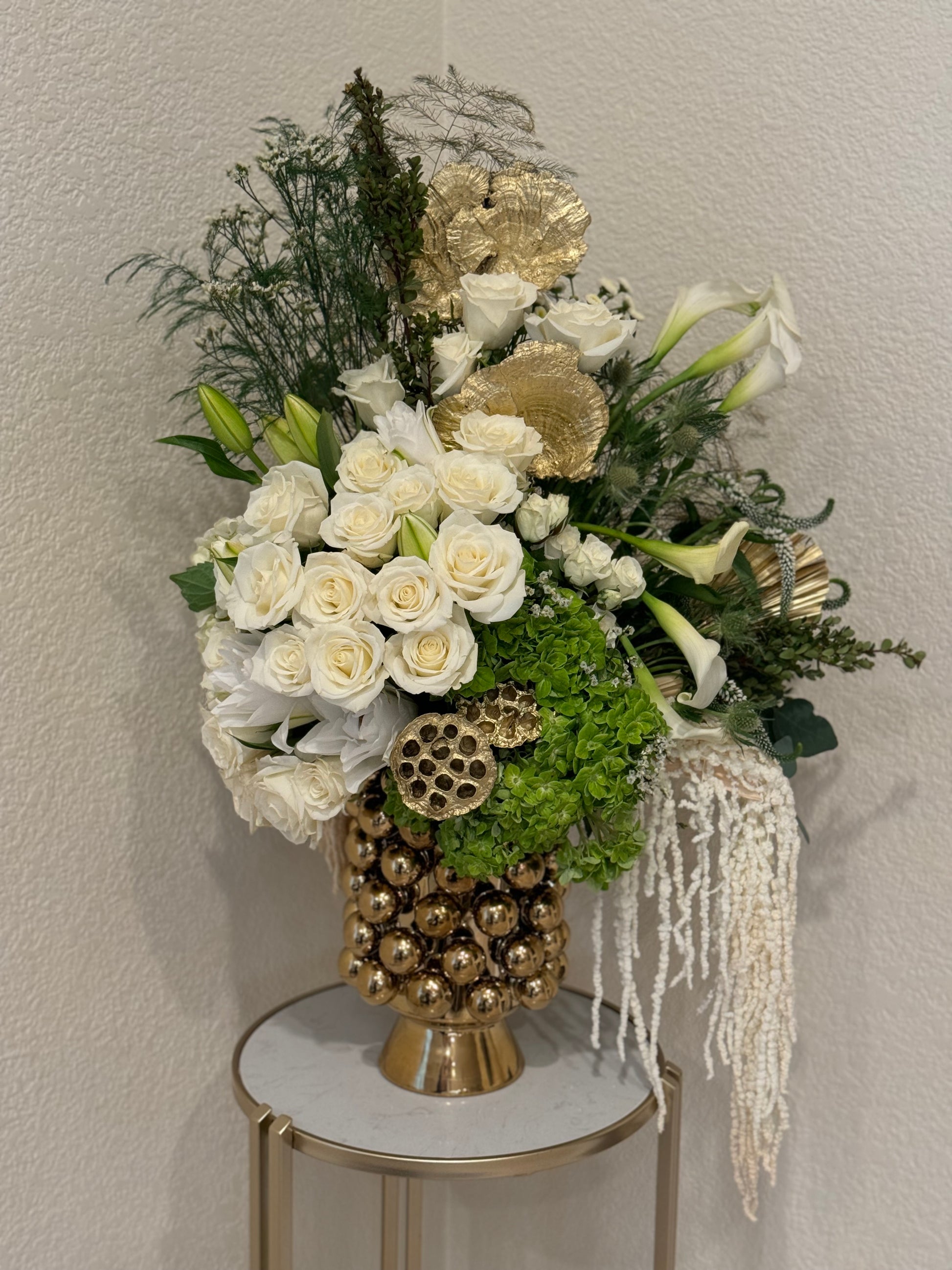 This luxurious arrangement features elegant white roses, lilies, and lush greenery, beautifully accented with gold decorative elements, all set in a stunning gold textured vase for a sophisticated and opulent display.