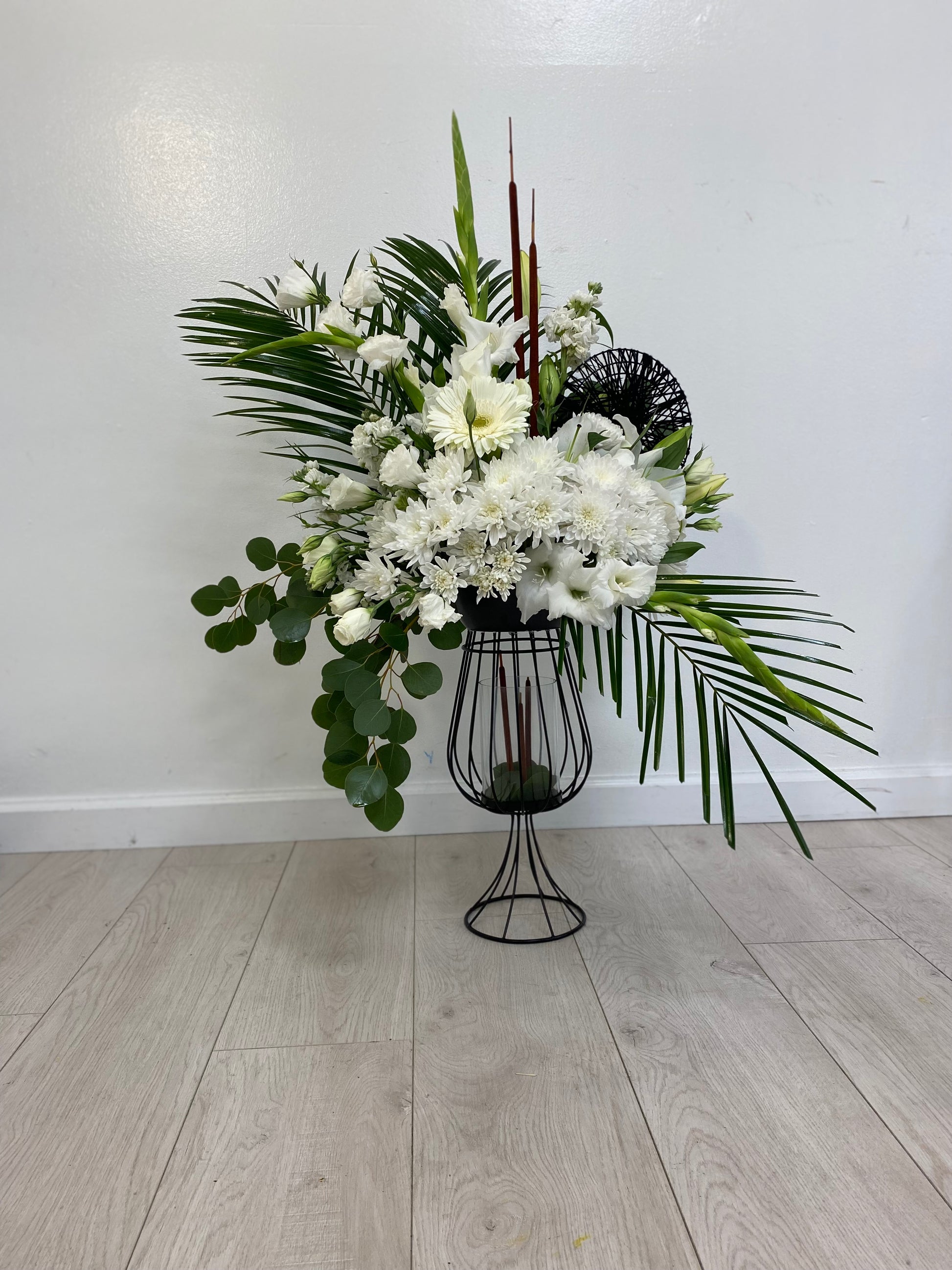 This arrangement features white flowers and lush greenery.