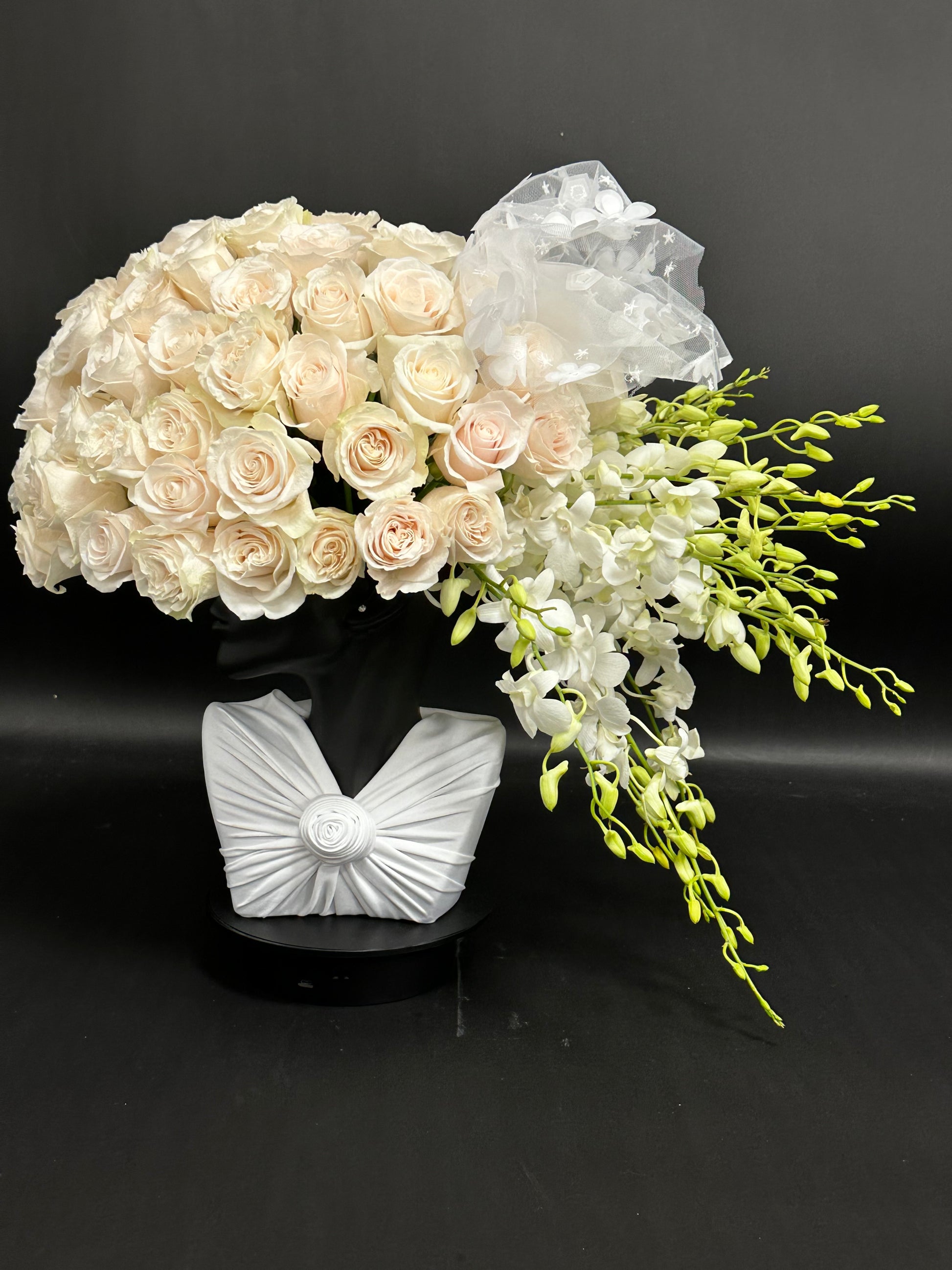 This elegant arrangement features soft ivory roses and cascading white orchids, artfully displayed in a sculptural black vase designed as a feminine silhouette with intricate white draping, creating a luxurious and refined floral design.