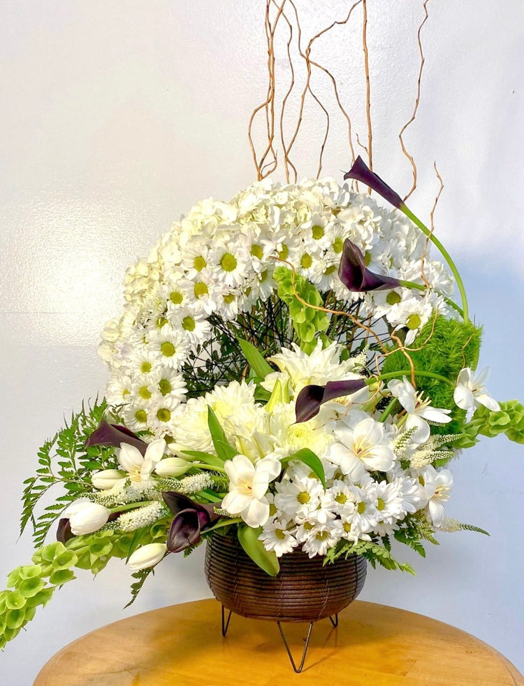 This arrangement features a combination of white flowers accented by deep purple calla lilies and greenery.