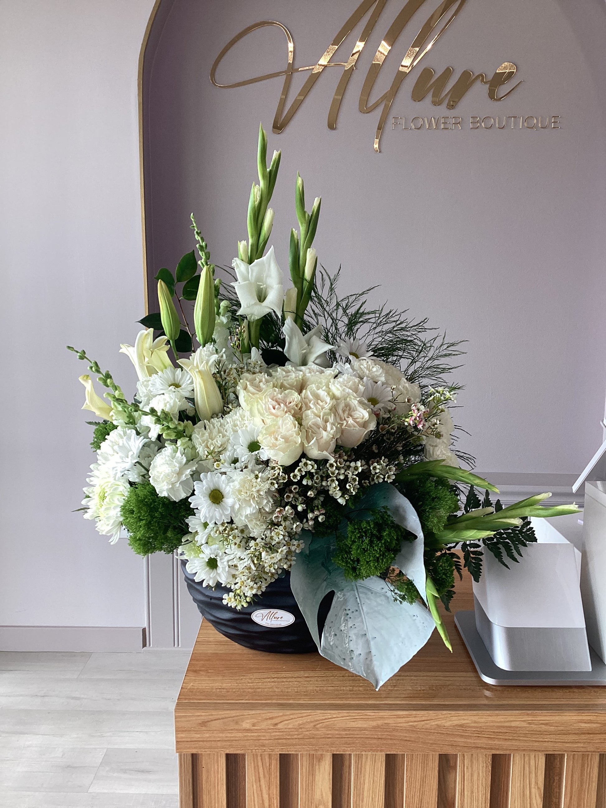 A graceful arrangement of white roses, gladiolus, lilies, and seasonal blooms, styled with sculptural greenery and soft textures. Designed in a deep-tined vase.